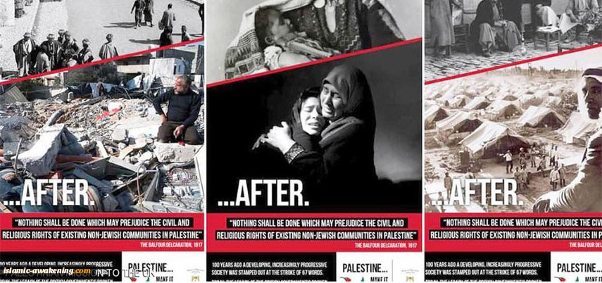 وحملت اللافتات صور الحیاة العادیة قبل الإعلان فی مقابل حیاة الدمار  والتهجیر بعده، کما حملت فی المقابل تذکیراً بأنه "لا یجوز القیام بأی شیء  قد یضر بالحقوق المدنیة وحقوق المجتمعات غیر الیهودیة الموجودة فی فلسطین"، دون ذکر کلمة (اسرائیل).