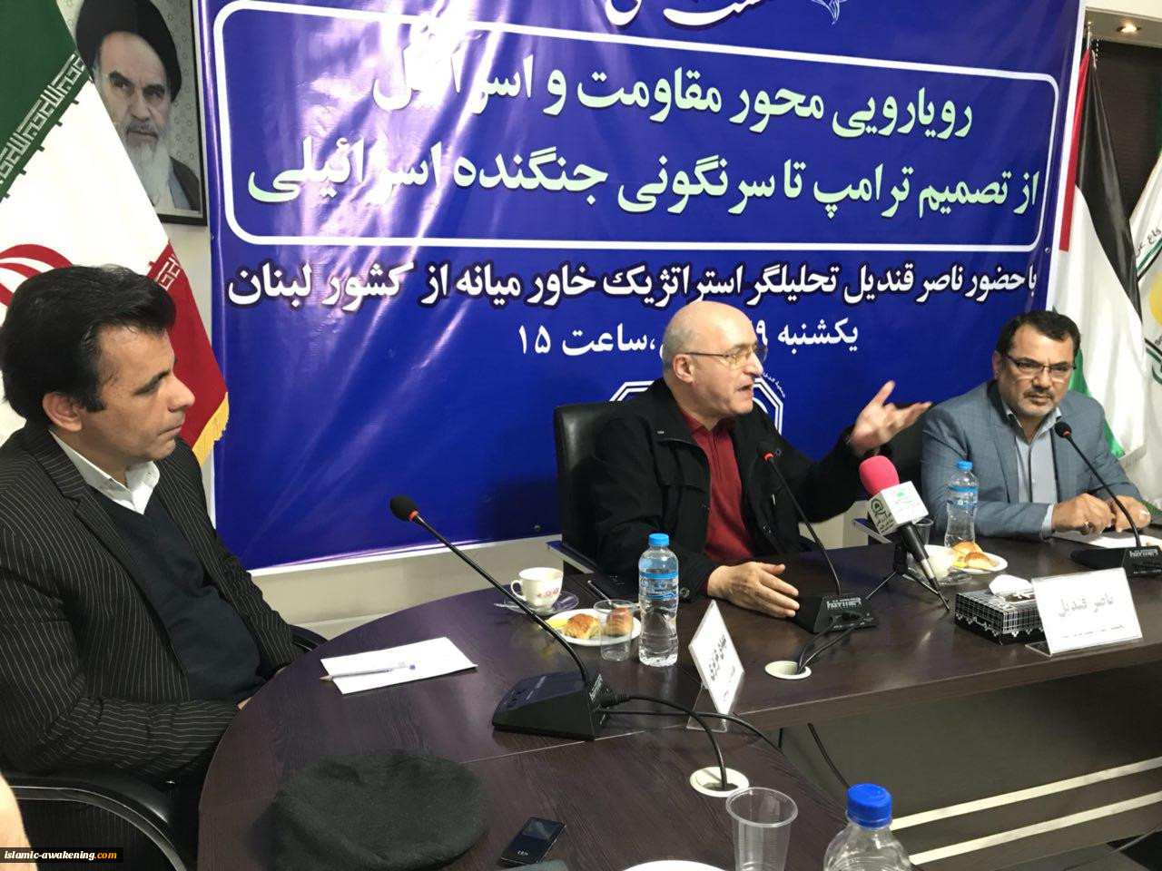 وتابع قنديل قائلا: إن قرار ترامب بشأن القدس له دلالة أخري ايضا وهي أن هذا القرار يعتبر رمزاً استراتيجياً عنوانه رفض مشروع التسوية المقدم من قبل روسيا. أن امريكا قدمت خيارات منها الدخول في مفاوضات حسب رؤيتها أم استمرار الوضع كما هو الآن، لكن المقاومة قدمت خياراً ثالثا وهو أن المقاومة في الميدان سوف تحسم المعركة وأنها مستعدة لاي سيناريو جديد، في حين أن امريكا تفضل وجود مفاوضات دون التوصل إلي اي نتائج.