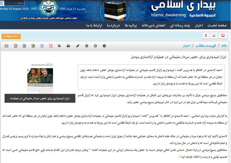 امتیاز دهید : ابراز امیدواری برای حضور سردار سلیمانی در عملیات آزادسازی موصل 3 دوشنبه 11 مرداد 1395 ساعت 11:36